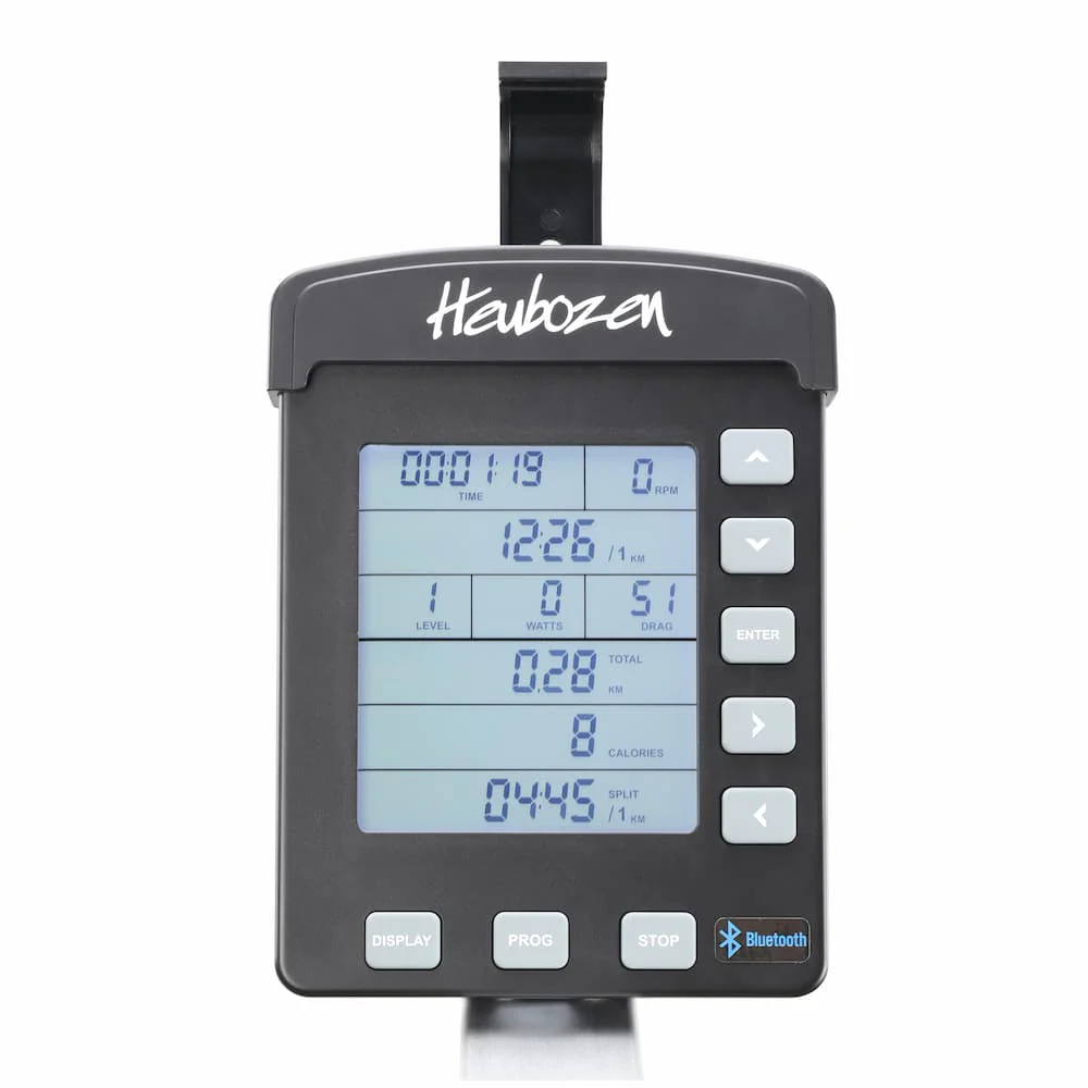 Sa console inclinable avec 8 boutons offre une lecture claire des performances : fréquence de rame (RPM), distance, calories brûlées, rythme cardiaque (avec ceinture en option), et enregistre jusqu’à 35 entraînements. Il dispose de 8 programmes d’entraînement (comptes à rebours, intervalles, etc.) et est compatible avec Kinomap et Zwift via Bluetooth pour des entraînements immersifs en mode multijoueur.