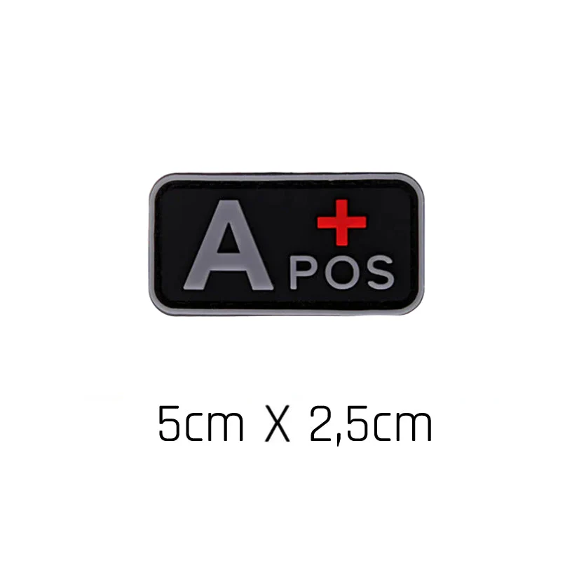 Blood Type Patch (A+, B+, AB+, O+, A-, B-, AB-, O-) Black/Grey with velcro so you can personalize your Gympack backpack. Material: Rubber Dimensions: 5 cm x 2.5 cm