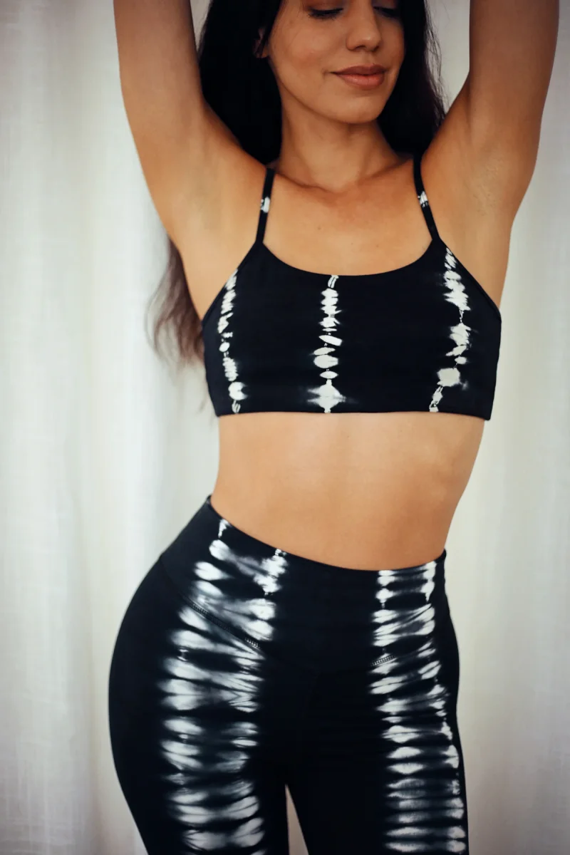 La Brassière Aura en fibres de bambou associe simplicité et style avec son motif Charcoal, un mélange subtil de noir profond et de bleu nuit, rehaussé de motifs tie and dye blancs verticaux.