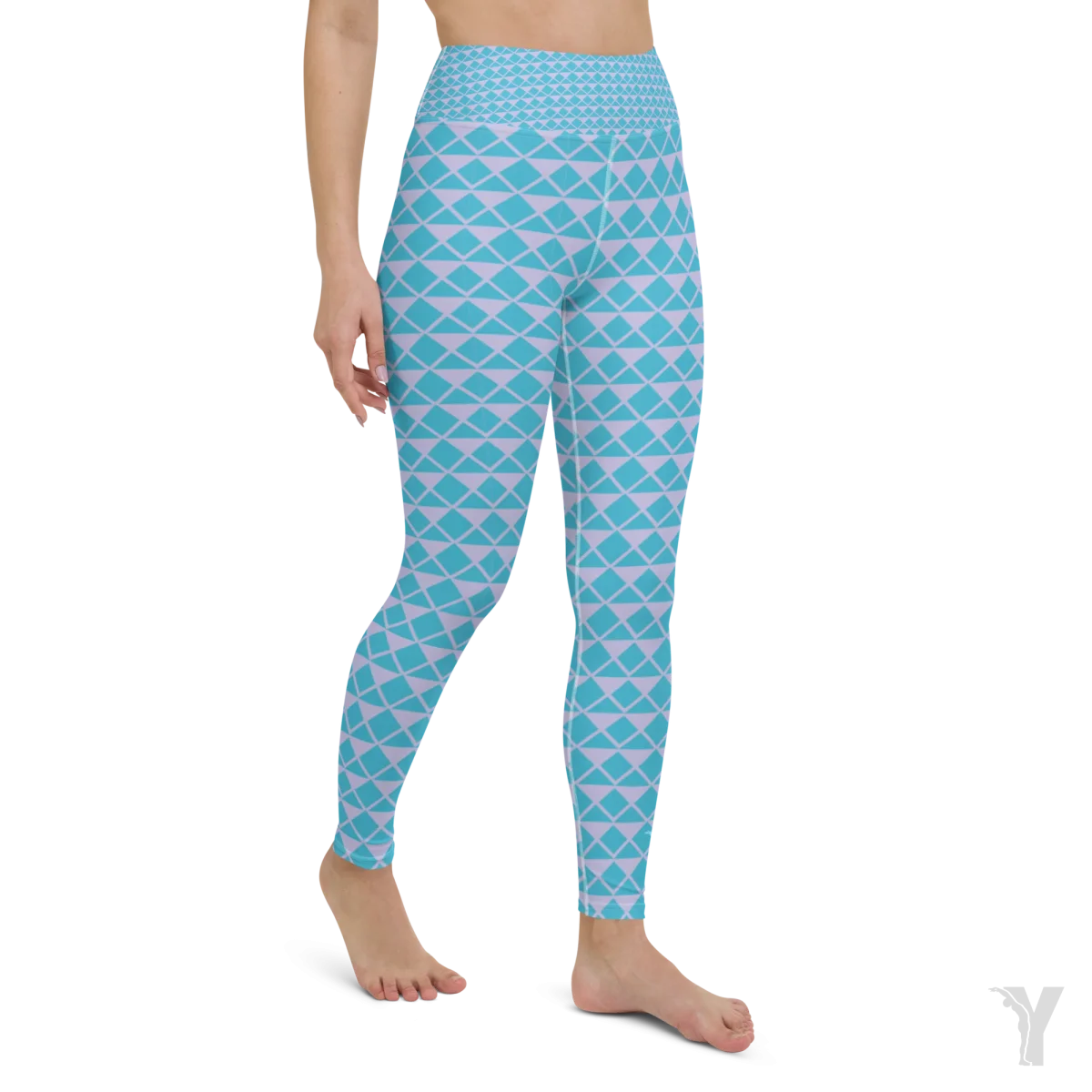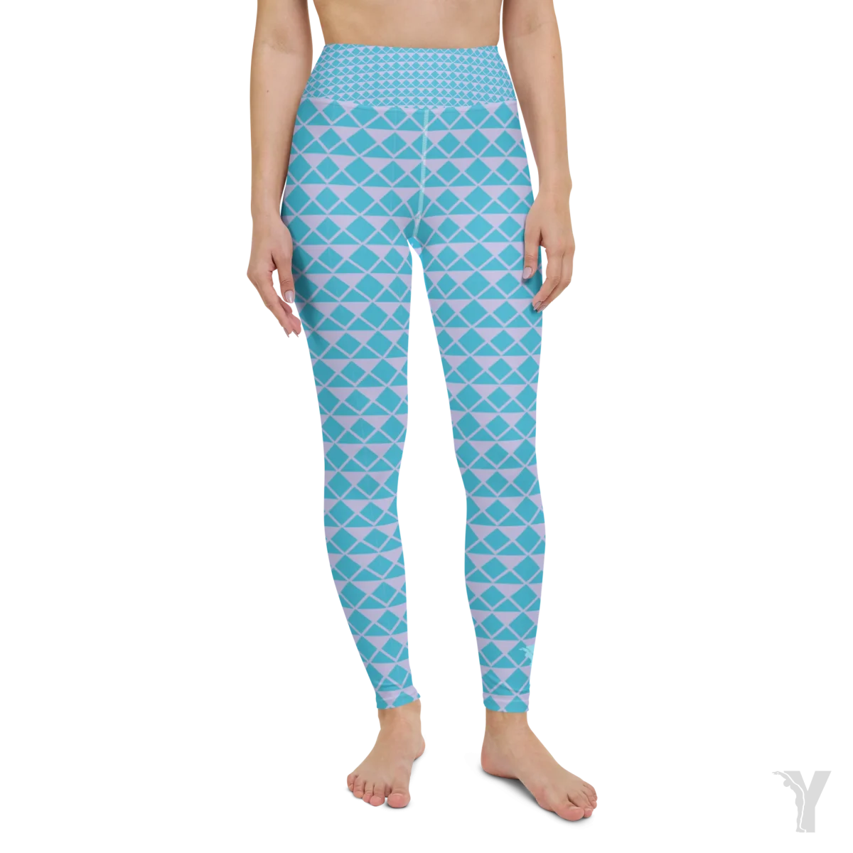 le motif de ce legging est un maillage de triangle rose et bleu. Le logo Yofe est positionné sur le bas de cheville gauche et au niveau de la ceinture arrière.