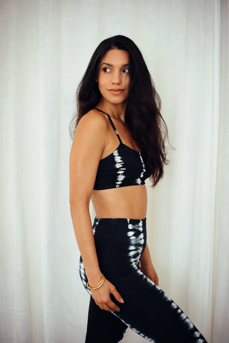 Chaque legging de yoga est une pièce unique, fabriquée artisanalement dans nos ateliers à Bali. Le motif tie and dye, travaillé avec soin, et le coloris Charcoal – alliance sophistiquée de noir profond et de bleu nuit, illuminée de motifs blancs – apportent une élégance intemporelle à votre tenue de yoga.
