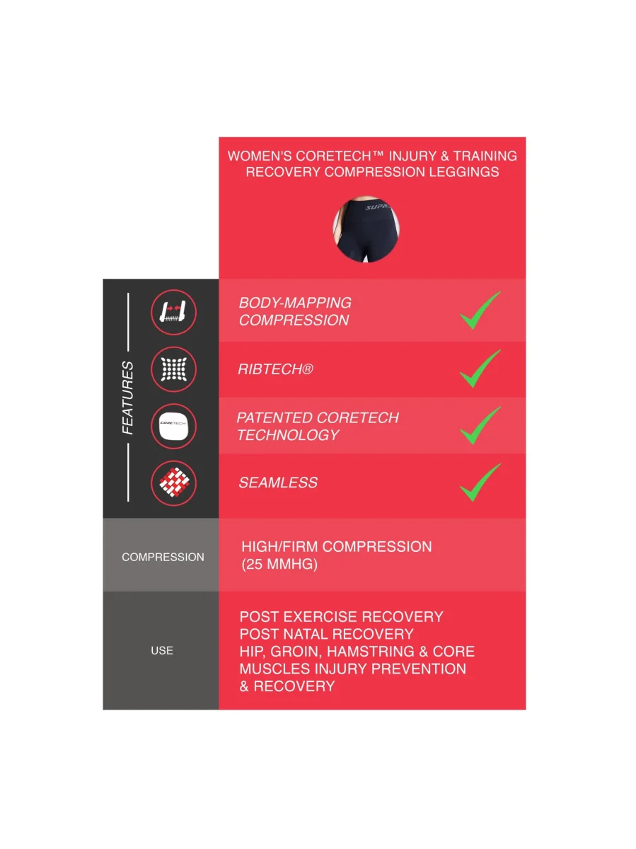 Supacore Coretech leggings use leading medical-grade compression to help alleviate lower body discomfort, muscle pain and pelvic instability associated with postpartum and injury recovery.