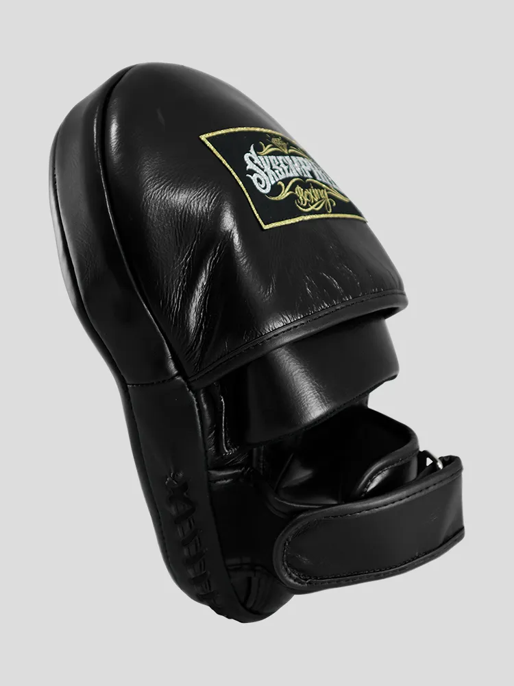 100% Hand made in Thailand Cuir Curve design. Perfect for heavy punch and speed kicking drills, it’s also ideal for elbow and knee techniques. Velcro enclosure Handily close-fingers