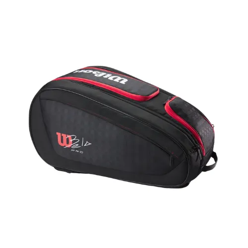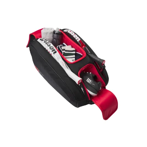 Sac premium Wilson Bela V3 Noir/Rouge : compartiment isotherme Thermoguard, espace chaussures aéré, poches accessoires sécurisées & sangles matelassées. Parfait pour joueurs exigeants recherchant protection, confort et style.