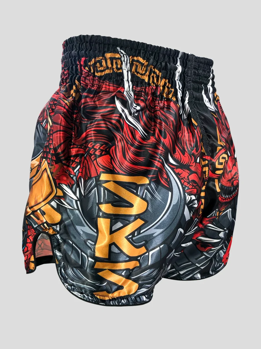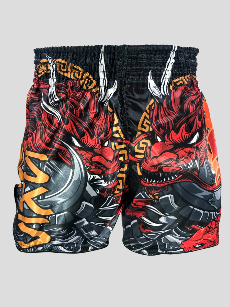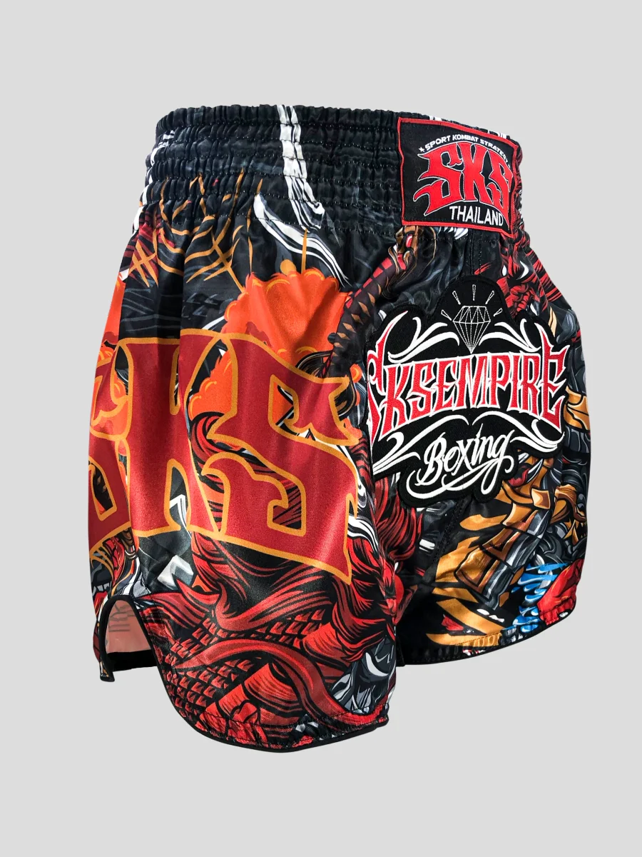 SKS INFERNO Eragon Shorts Renewed design Retro Muay Thai shorts designed for Multi types of boxing, straight cut, ideal for Muay Thai, K1, and kickboxing, Premium quality, strong and comfortable, Handmade in Thailand Comfortable to wear Breathable fabric Elastic waistband Embroidery logo Muay Thai Shorts Screen Printed Made in Thailand