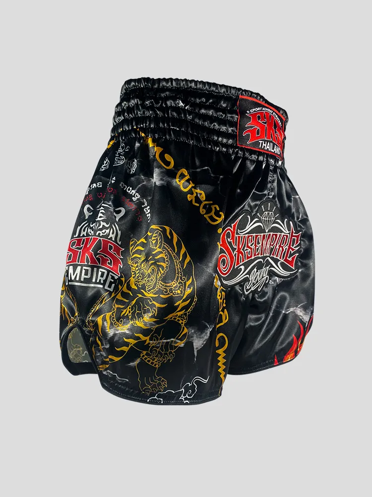 SKS INFERNO Tiger Shorts Renewed design Retro Muay Thai shorts designed for Multi types of boxing, straight cut, ideal for Muay Thai, K1, and kickboxing, Premium quality, strong and comfortable, Handmade in Thailand Comfortable to wear Breathable fabric Elastic waistband Embroidery logo Muay Thai Shorts Screen Printed Made in Thailand