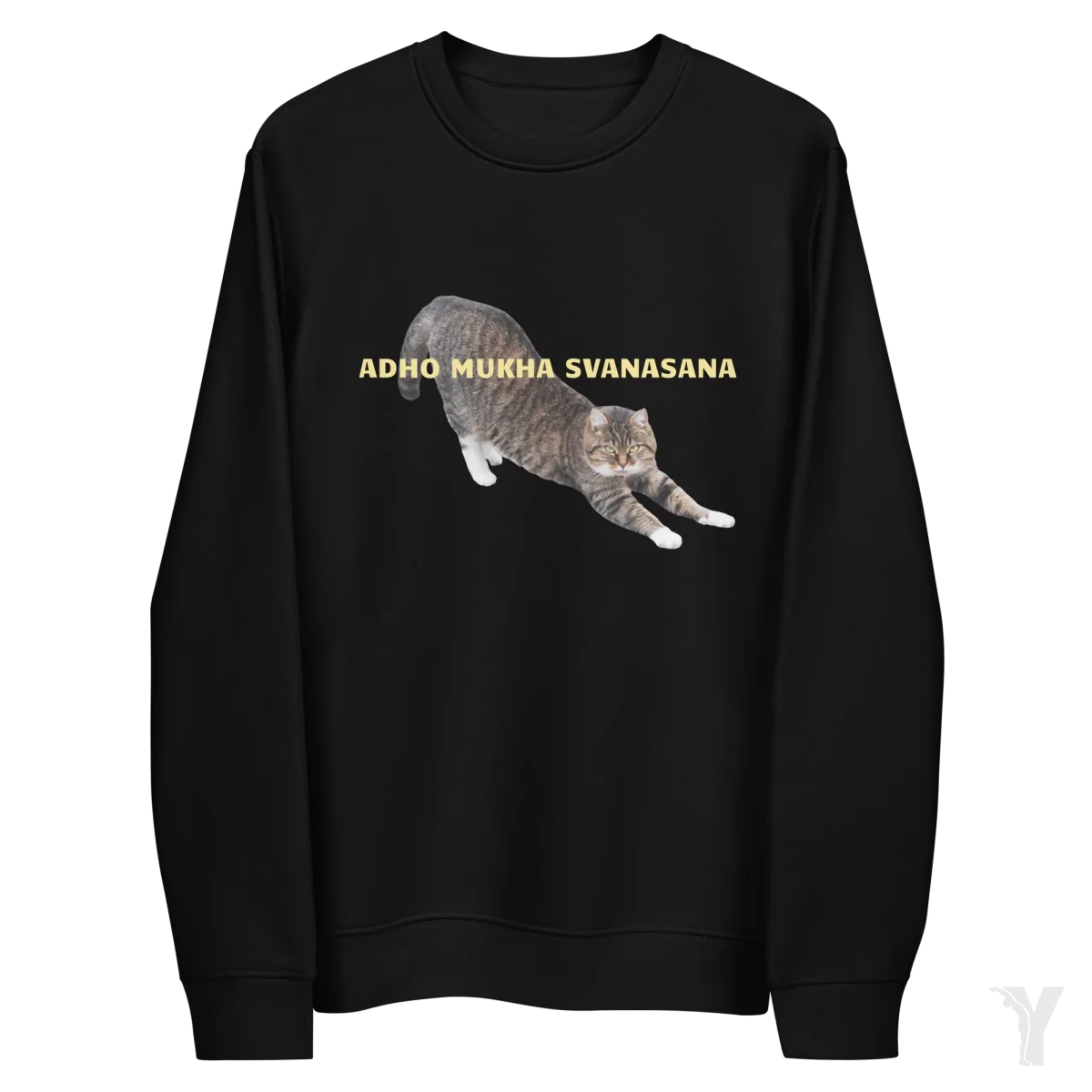 ce sweatshirt éco responsable est disponible en couleur noir avec une jolie photo de chat pratiquant Chien tête en bas, un paradoxe ou antinomique… au choix.