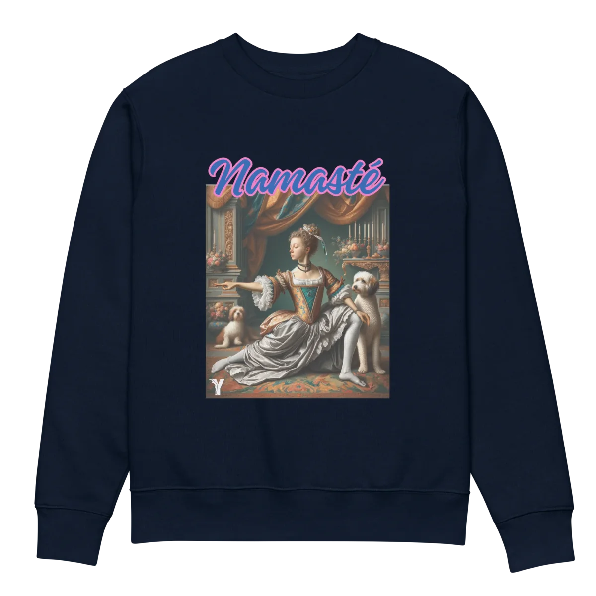 Inspiré par l’élégance du 18ème siècle, il combine parfaitement l’art classique et la culture moderne. L’imprimé met en scène la jeune Marie Antoinette entourée de ses fidèles compagnons à quatre pattes, en train de réalisé un guerrier II royal, avec une touche d’humour et de sérénité grâce au message « Namasté ».