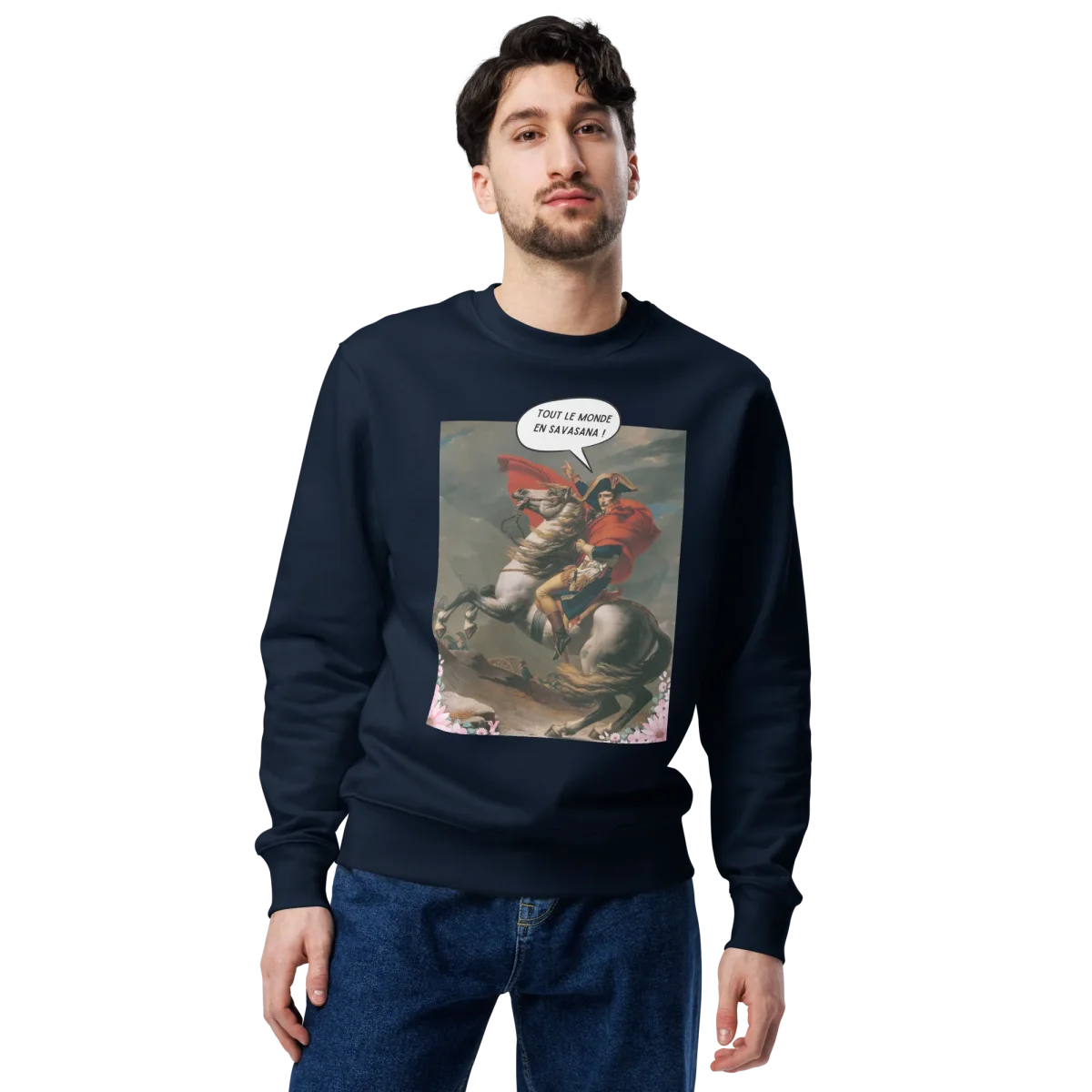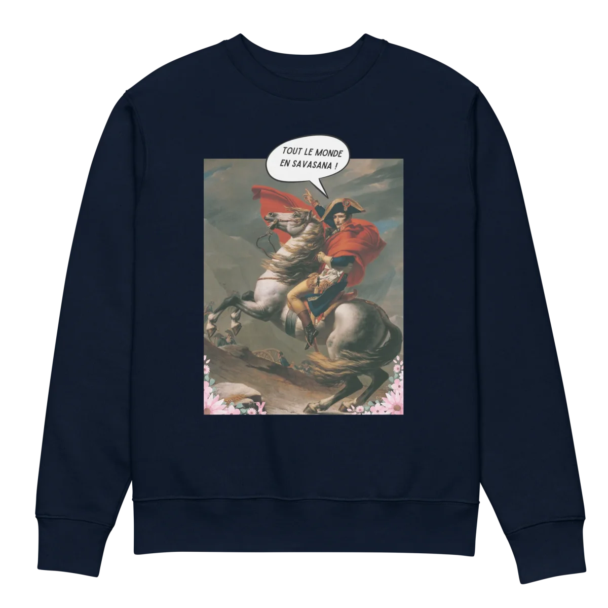 Ajoute une touche d’humour et de culture à ta garde-robe avec ce sweatshirt homme unique. Sur le devant, une interprétation revisitée de Napoléon en pleine pose épique, proclamant fièrement : « Tout le monde en Savasana ! ». Parfait pour les fans de yoga, d’histoire ou simplement ceux qui aiment se démarquer avec un look original et audacieux.