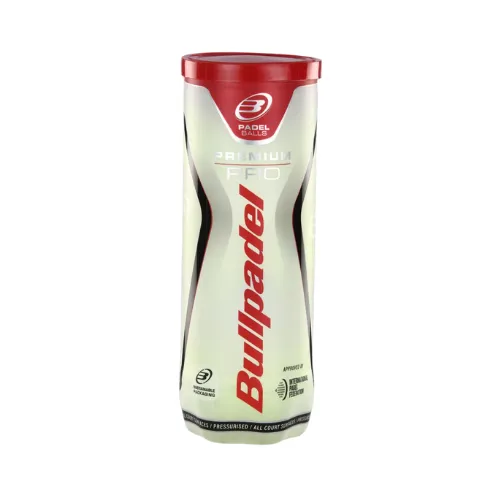 Tube de 3 balles BULLPADEL Premium Pro : feutre synthétique durable, noyau haute densité, rebond vif – parfait pour un jeu rapide et intense.