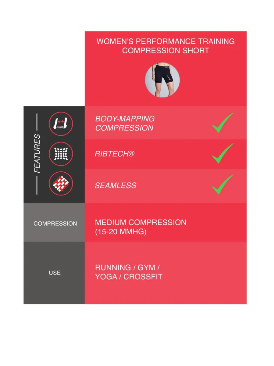 Women’s body mapped Performance Training Compression Short (Black) You may be eligible for a Private Health Fund Rebate. Please check your fund for eligibility.
